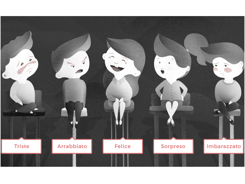Un bambino è felicissimo, uno imbarazzato, uno molto triste, uno arrabbiato e un altro sorpreso. Riesci a capire le loro emozioni muovendoti col puntatore sui loro volti?